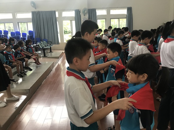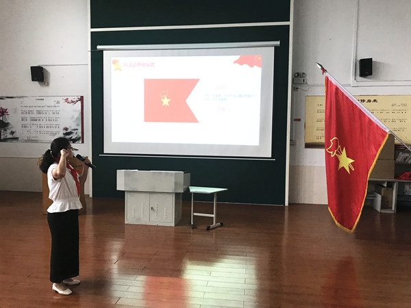 雄壯有力的出旗曲奏響了,就此拉開(kāi)了儀式的序幕。一年級(jí)隊(duì)員排著整齊的隊(duì)伍,響亮地唱起《中國(guó)少年先鋒隊(duì)隊(duì)歌》。鮮艷的隊(duì)旗下,大隊(duì)輔導(dǎo)員莫冰老師宣讀了“入隊(duì)決定”,并宣布新隊(duì)員名單。老隊(duì)員為新隊(duì)員系上了紅領(lǐng)巾,鮮艷的紅領(lǐng)巾在新隊(duì)員胸前飄揚(yáng),映紅了孩子們的笑臉。隨后莫冰老師宣布新成立的2個(gè)中隊(duì),同時(shí)聘任中隊(duì)和中隊(duì)輔導(dǎo)員,緊接著進(jìn)行的是宣誓,新隊(duì)員們鄭重地舉起右拳,在隊(duì)旗下莊嚴(yán)宣誓。中隊(duì)輔導(dǎo)員也對(duì)隊(duì)員們表示祝賀,希望新隊(duì)員們要有崇高的理想,要胸懷大志、勉勵(lì)全體少先隊(duì)員努力學(xué)習(xí),用自己的實(shí)際行動(dòng),為隊(duì)旗增光添彩。
