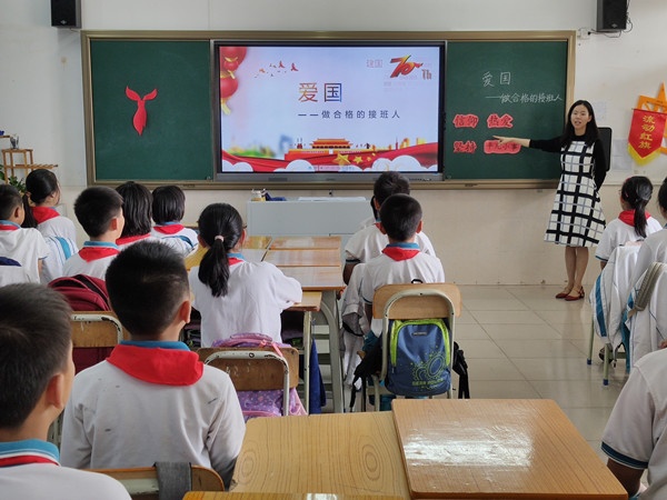 糜秀慧子老師以“做合格的接班人”為題,開篇先讓孩子看“江姐”的故事,讓孩子明白先烈們愛國的堅定信仰。接著觀看新中國成立70周年取得的偉大成果,學(xué)生討論熱烈,踴躍發(fā)言,紛紛為祖國的發(fā)展感到自豪。糜老師通過具體的行為使學(xué)生明白愛國的具體做法,最后以重溫入隊誓詞,歌唱隊歌兩個環(huán)節(jié)對學(xué)生的情感進(jìn)一步地熏陶。