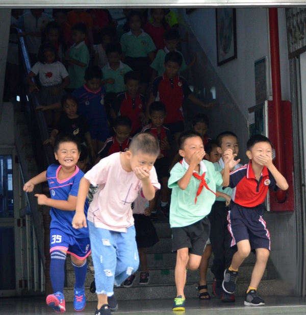 9點整,校園突然警報長鳴,在相關(guān)老師的協(xié)助引導(dǎo)下,全校1700多名師生按照預(yù)先布置的撤離路線從教學(xué)樓快速、有序地跑下樓梯,奔向操場集合,并清點人數(shù)報告總指揮。在有大量一年級新生第一次加入演練情況下,整個過程用時2分多鐘,逃生演練的效果非常顯著。