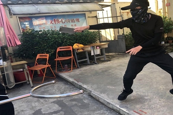 本次模擬場(chǎng)景:清晨,學(xué)生上完早讀課后,正三三兩兩地走出課室的時(shí)候,一名蒙面的持刀歹徒突然闖進(jìn)校園。學(xué)校立即啟動(dòng)安全預(yù)防校園暴力事件應(yīng)急預(yù)案,學(xué)校德育處郝利娟主任播放警情通知:“有歹徒闖入校園,同學(xué)們快速到安全地方!全體老師快速到班級(jí)!” 安全組一名老師打電話報(bào)警,在學(xué)校附近的巡警火速趕到了現(xiàn)場(chǎng)。學(xué)校保安室三名保安人員立即持鋼叉和盾牌,老師們則有的持長(zhǎng)棍,有的隨手抓起板凳、鐵鍬等工具上前驅(qū)趕,在警察的配合下,大家一起將暴徒制服,最后警察將暴徒緝拿帶走。
