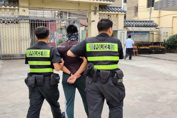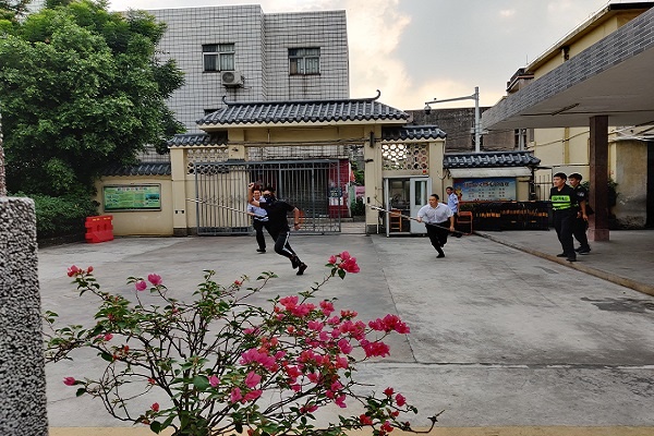 本次模擬場(chǎng)景:清晨,學(xué)生上完早讀課后,正三三兩兩地走出課室的時(shí)候,一名蒙面的持刀歹徒突然闖進(jìn)校園。學(xué)校立即啟動(dòng)安全預(yù)防校園暴力事件應(yīng)急預(yù)案,廣播員播放警情通知:“有歹徒闖入校園,同學(xué)們快速到安全地方!全體老師快速到班級(jí)!” 安全組一名老師打電話報(bào)警,在學(xué)校附近的巡警火速趕到了現(xiàn)場(chǎng)。學(xué)校保安室三名保安人員立即持鋼叉和盾牌,老師們則有的持長(zhǎng)棍,有的隨手抓起板凳、鐵鍬等工具上前驅(qū)趕,在警察的配合下,大家一起將暴徒制服,最后警察將暴徒緝拿帶走。