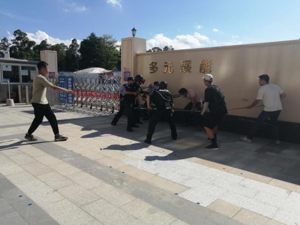 演練前,轄區(qū)派出所民警會同學(xué)校負責(zé)人和相關(guān)人員對演練內(nèi)容、演練保障、演練安全等問題進行了探討交流。下午4點,何廣志校長宣布反恐防暴安全演練正式開始。“歹徒”趁機闖入校園,值勤保安利用一鍵報警進行報警,同時發(fā)出警報,提醒教師組織全體學(xué)生保持鎮(zhèn)靜,快速引導(dǎo)學(xué)生到安全區(qū)域,做好防護,安全躲避。學(xué)校安全組成員聽到警報馬上趕到現(xiàn)場,協(xié)同保安人員手持警棍、防衛(wèi)器械等與“歹徒”周旋,最后配合趕到現(xiàn)場的民警將“歹徒”按倒在地,將其制服。