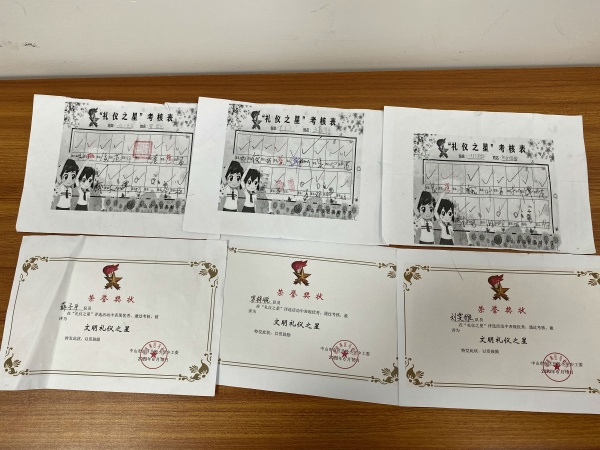 6月11、12日兩天,學校開展“禮儀之星”考評活動,學生向全校教師敬標準的隊禮以及問好后,獲得教師在其考核表上蓋章并簽名的獎勵,得到全校16位老師的簽名以及蓋章后,將獲得2020年馬嶺小學“禮儀之星”的獎狀。6月15日,學校利用升旗儀式舉行“禮儀之星”頒獎典禮。