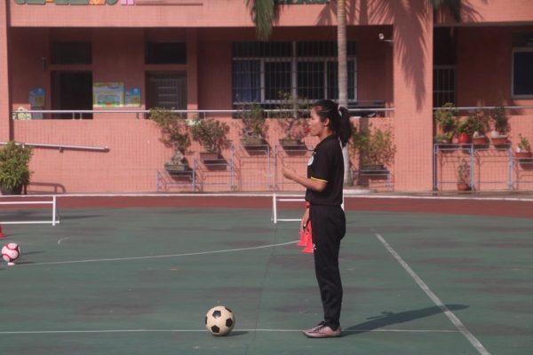 第二節(jié)課是由馬秋洪老師帶領(lǐng)對甫小學(xué)四(1)班的同學(xué)開展足球主題的體育課。教師、學(xué)生們英姿颯爽的身影,在操場上奔跑著、跳躍著,展現(xiàn)出了力與美的有機(jī)融合。