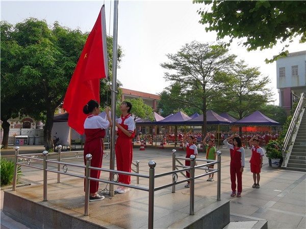 首先,石軍小學全體師生在大隊輔導員梁毅強老師主持下進行新學期第一次升旗儀式。隨著莊嚴肅穆的國歌聲,鮮艷的五星紅旗徐徐升起,拉開了開學典禮的序幕。