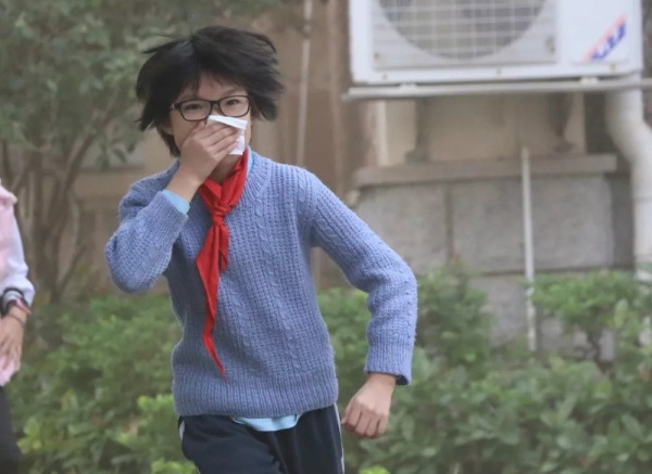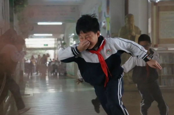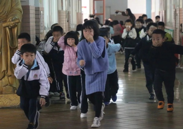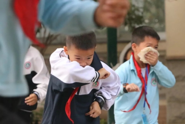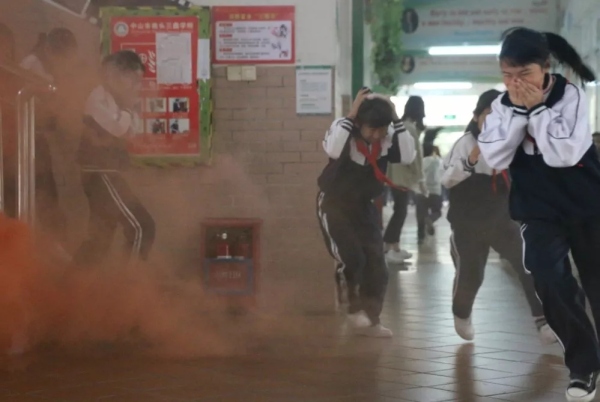 當(dāng)天上午8點(diǎn)45,樓道濃煙滾滾,刺耳的警鈴聲響起,學(xué)生們?cè)诶蠋煹慕M織下,迅速把毛巾打濕、捂住口鼻,以最快的速度有序地從通道口撤離“火災(zāi)”現(xiàn)場(chǎng)。