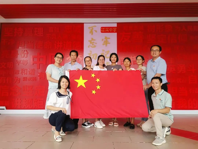 學(xué)校黨總支副書(shū)記周霞帶領(lǐng)黨員與國(guó)旗合影