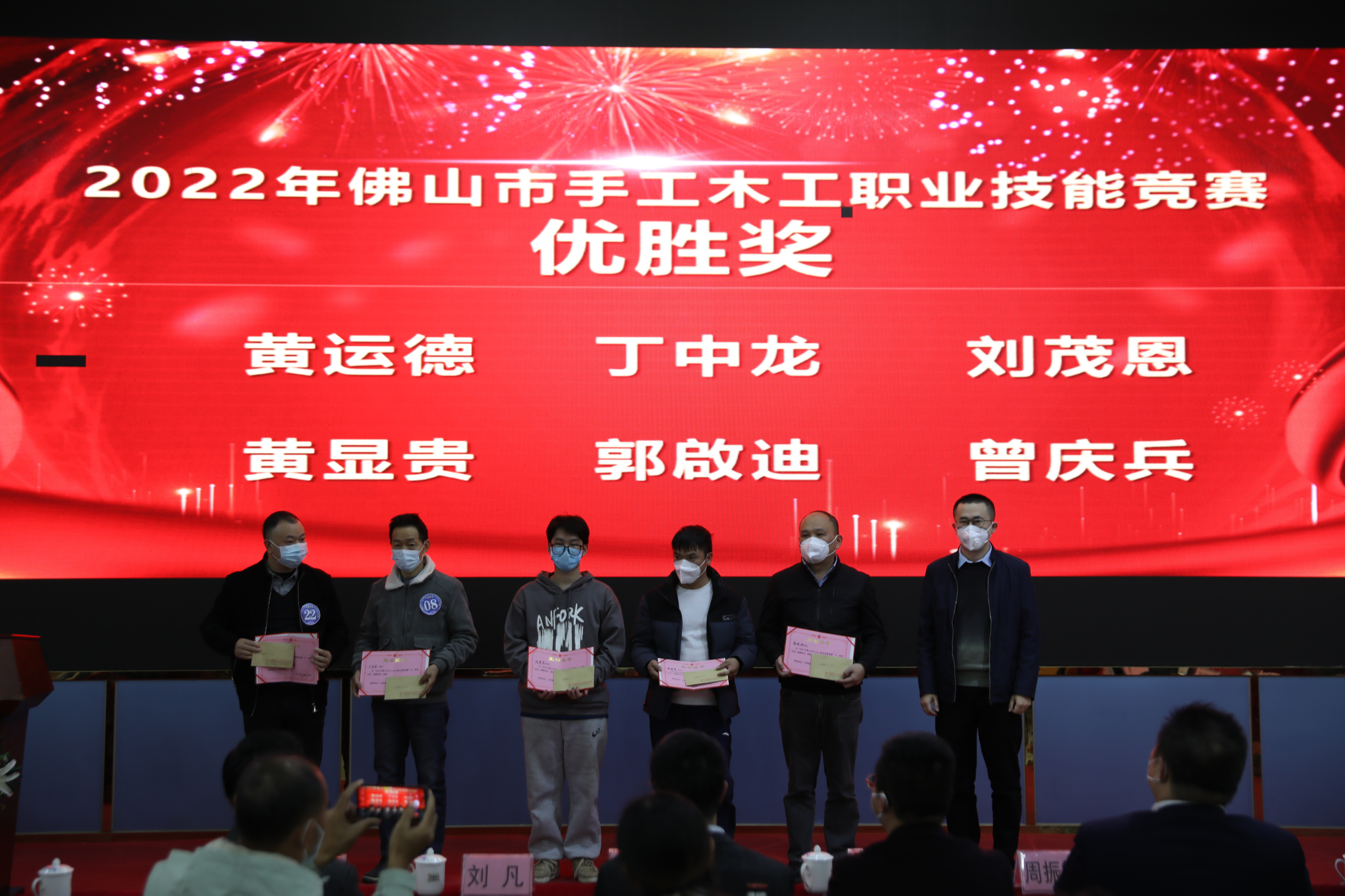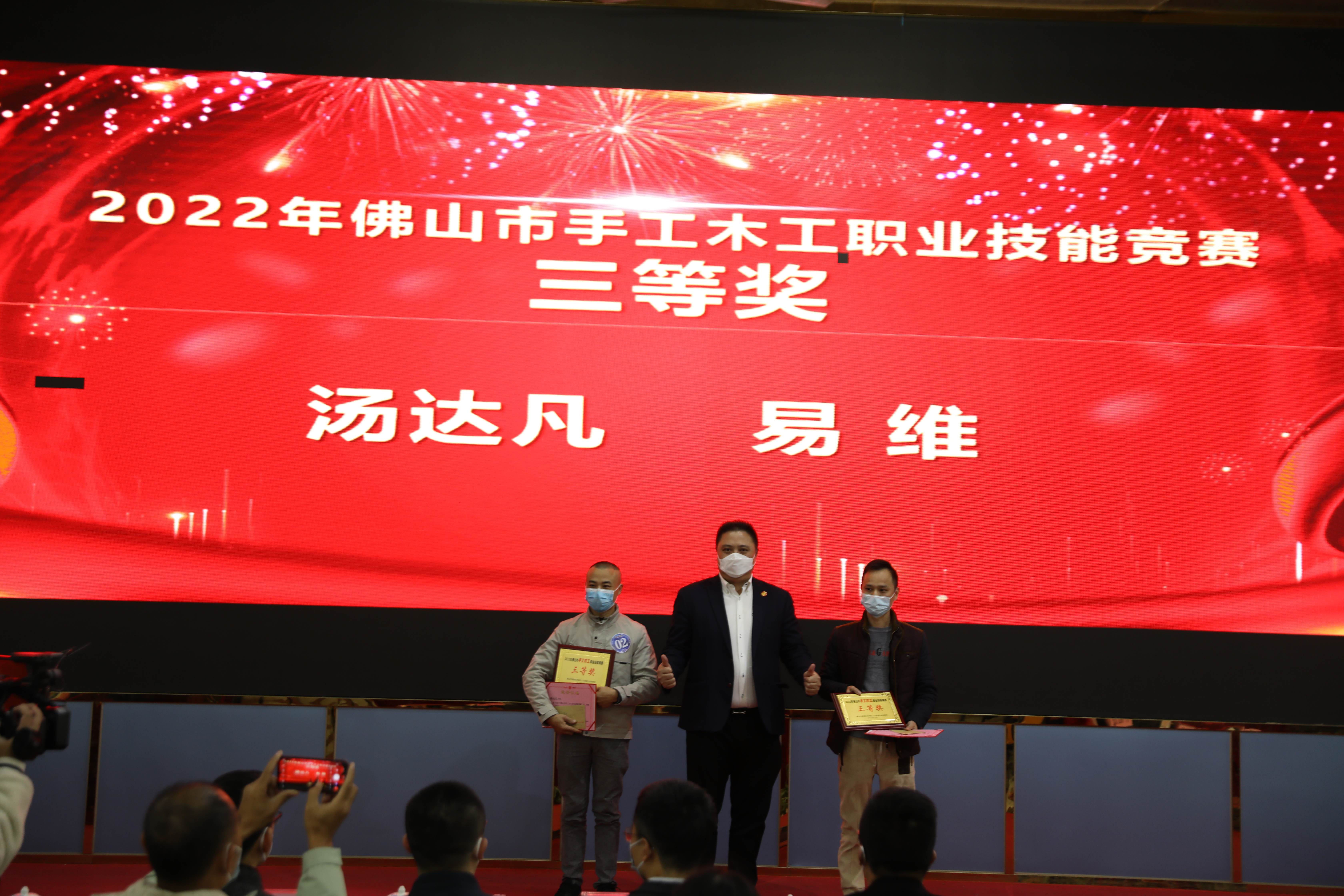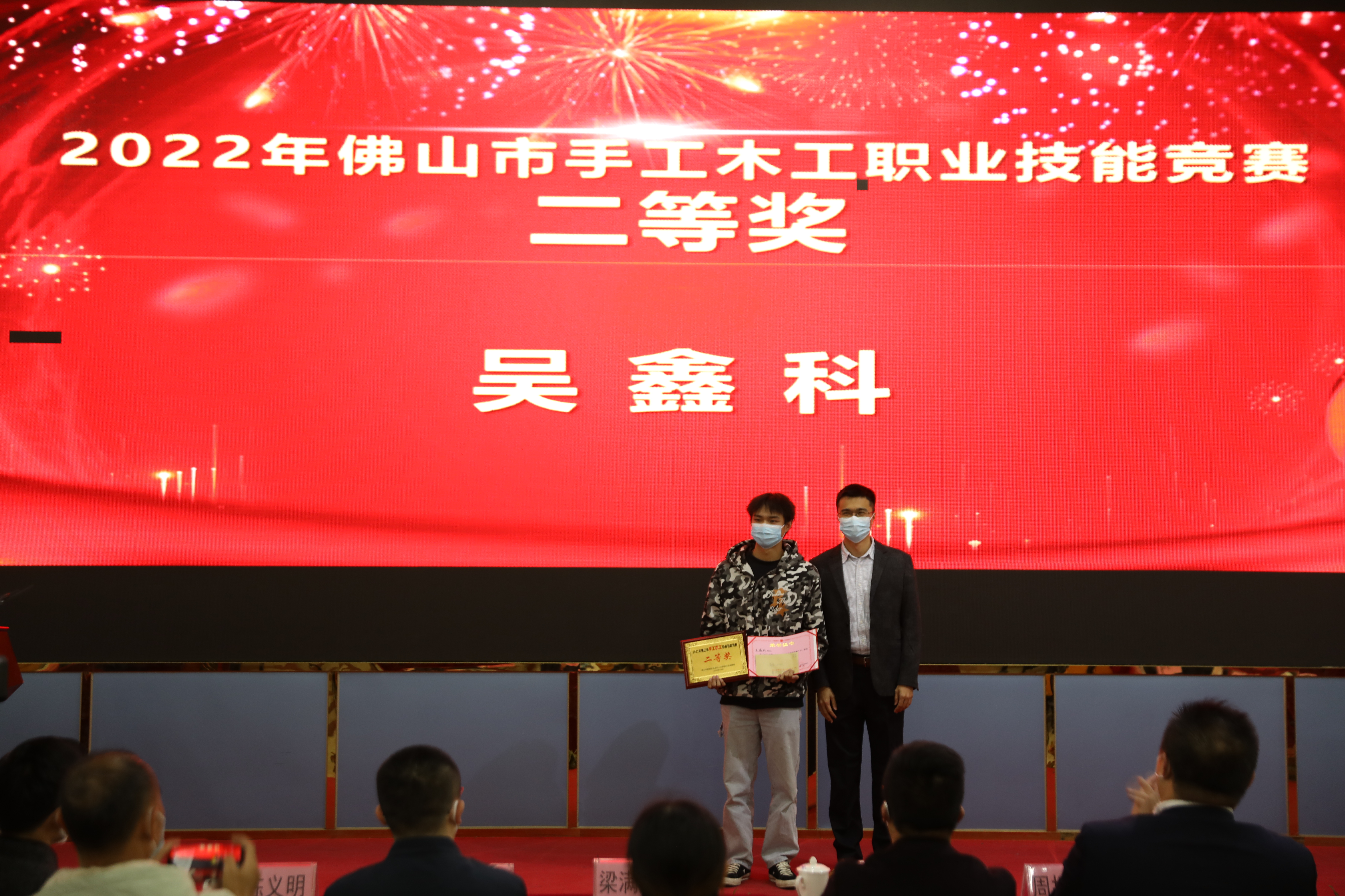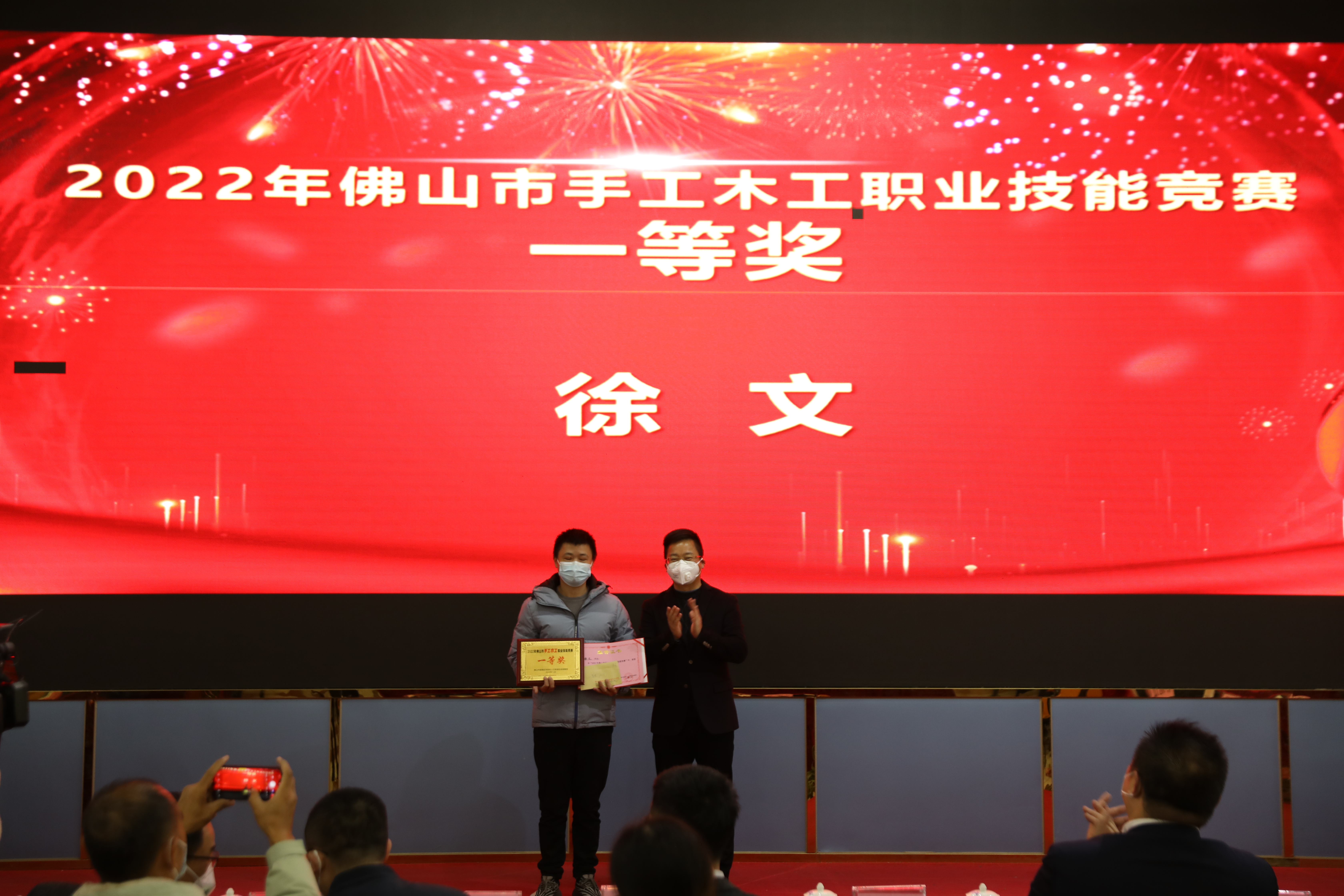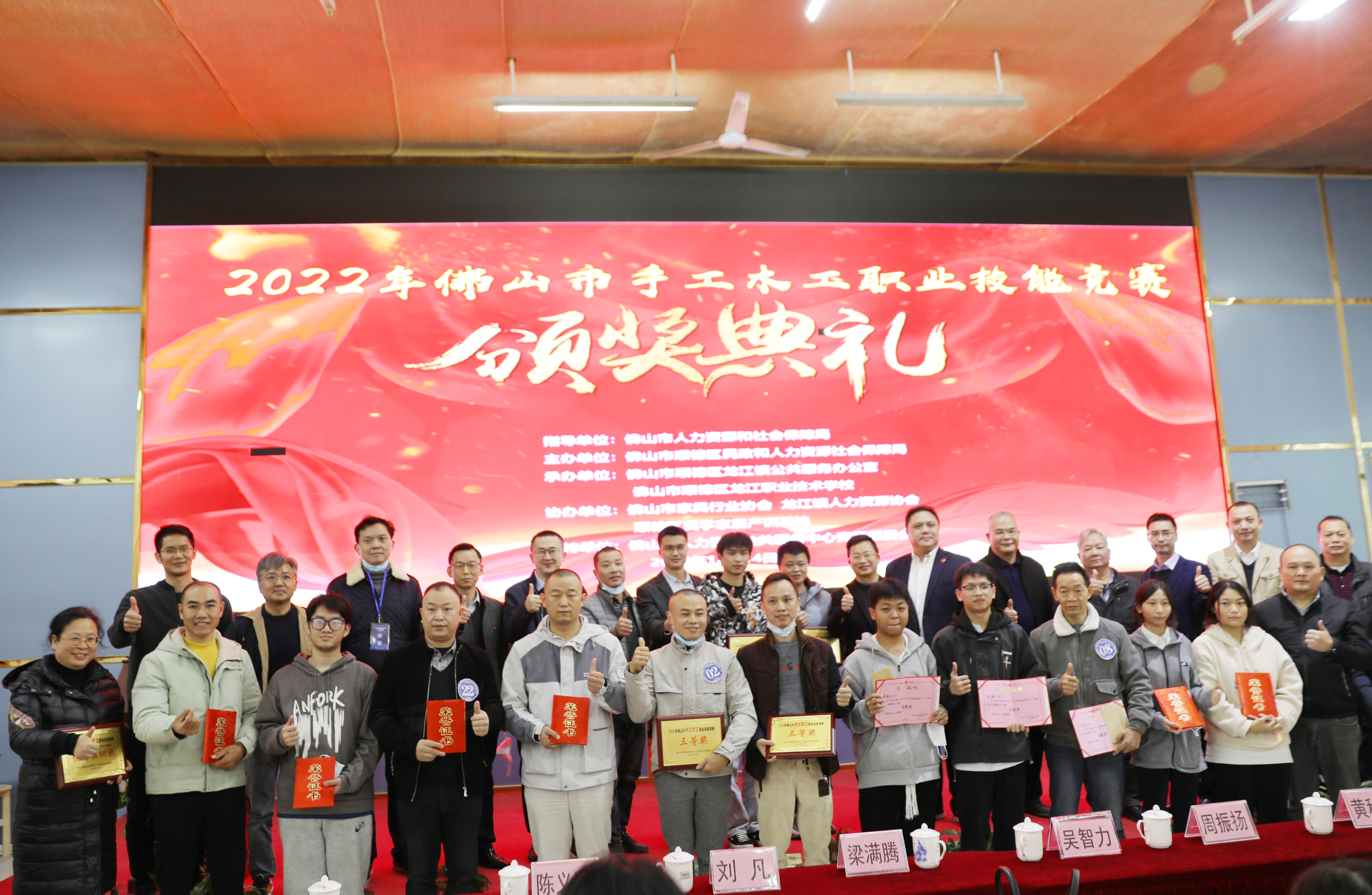 順德區(qū)民政和人力資源社會(huì)保障局就業(yè)促進(jìn)科科長劉凡為木工大賽優(yōu)勝獎(jiǎng)獲獎(jiǎng)?wù)哳C獎(jiǎng)