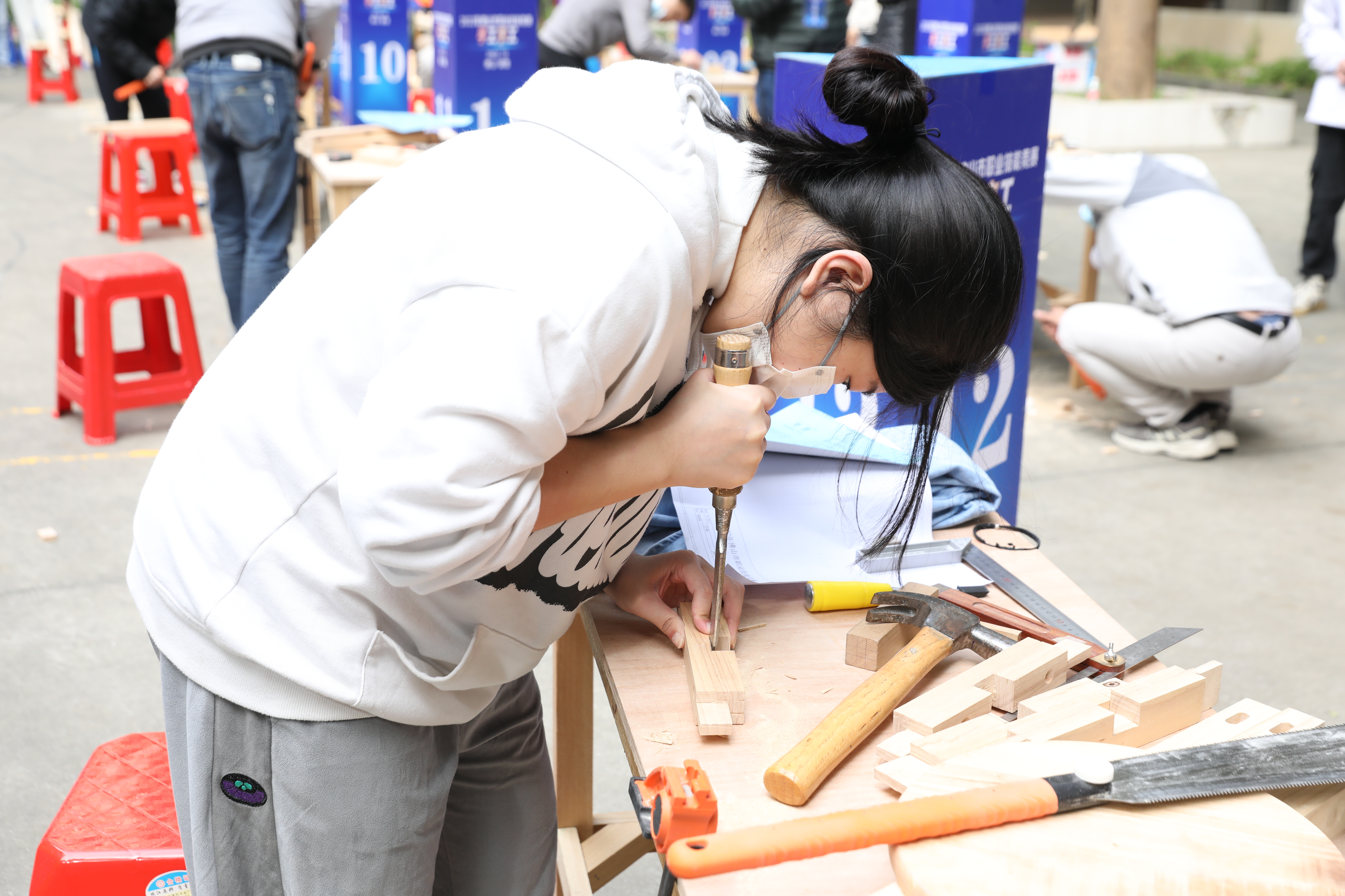 參賽者在禮儀的帶領(lǐng)下分組有序進(jìn)入賽場。比賽現(xiàn)場,參賽選手可用劃線器、鋸、鑿、刨等工具,展開測量、切割等工作。按照比賽要求,選手們要在3個(gè)小時(shí)內(nèi),完成制作一張木凳,很是考驗(yàn)選手的木工功底。
