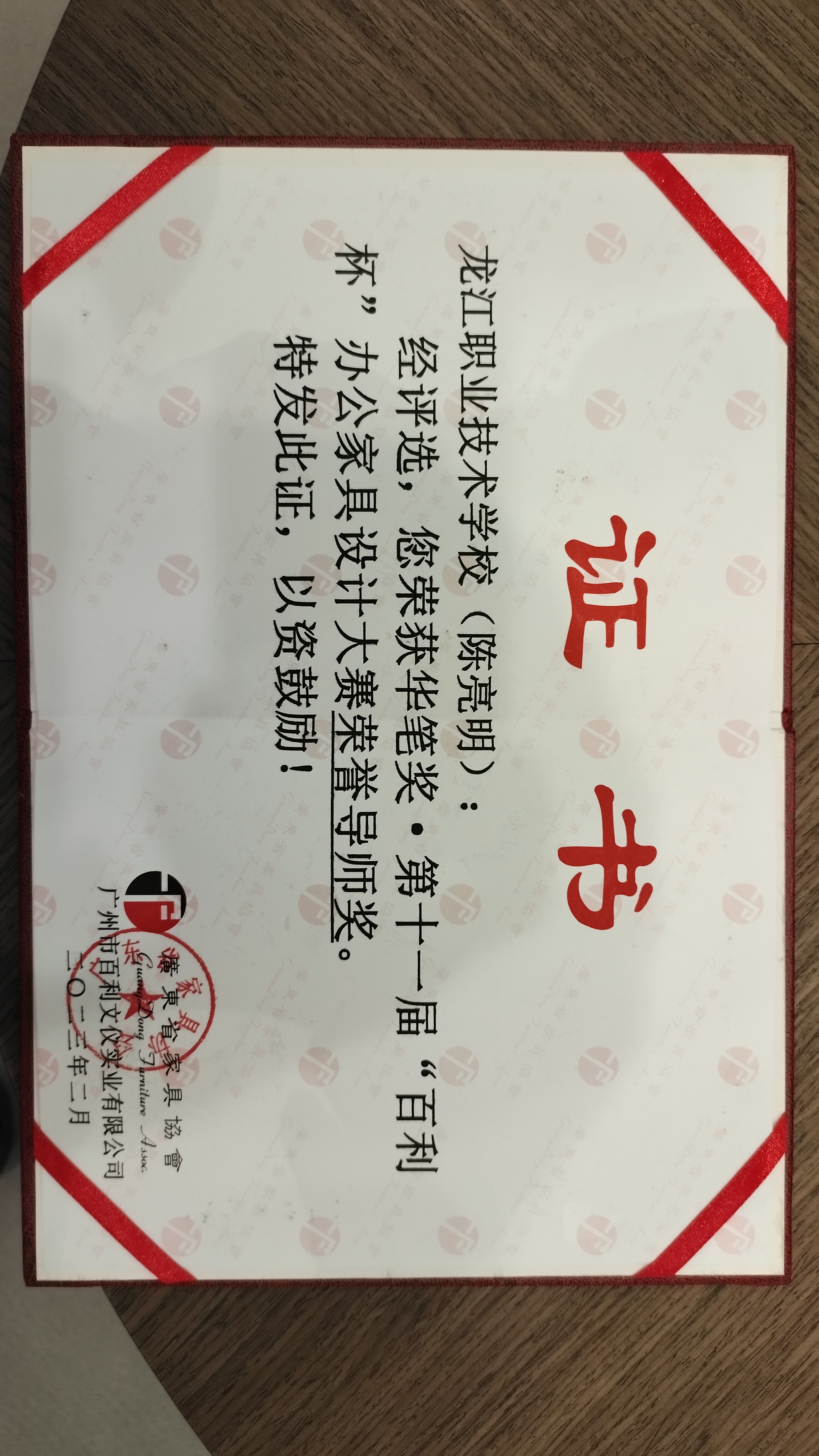 學(xué)校家具專(zhuān)業(yè)骨干教師陳亮明(右二)榮獲榮譽(yù)導(dǎo)師獎(jiǎng)