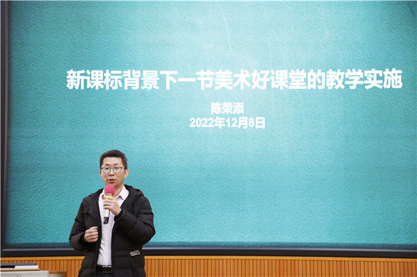 研討結(jié)束后,美術(shù)高級(jí)教師、佛山市美術(shù)兼職教研員、陳村鎮(zhèn)美術(shù)中心教研組長(zhǎng)陳榮添老師作了題為《新課標(biāo)背景下一節(jié)美術(shù)好課堂的教學(xué)實(shí)施 》的精彩講座。講座主要圍繞“藝術(shù)新課程標(biāo)準(zhǔn)”進(jìn)行了詳細(xì)的解析分享。陳老師結(jié)合個(gè)人教學(xué)經(jīng)歷,以詳實(shí)的案例加以佐證,闡述了新課標(biāo)下美術(shù)課堂要以學(xué)生為主,培養(yǎng)學(xué)生的核心素養(yǎng),堅(jiān)持以美育人,教師要與時(shí)俱進(jìn),適應(yīng)新時(shí)代要求的教育教學(xué)標(biāo)準(zhǔn)?!皫熤敢粭l路,燭照萬(wàn)里程”,陳老師的精彩講座引發(fā)了在場(chǎng)美術(shù)教師對(duì)美術(shù)課堂教學(xué)新的思考。
