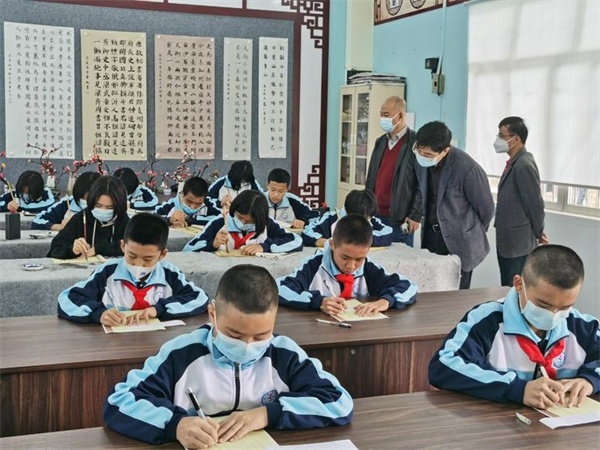 專家們行走在校園之間,負(fù)責(zé)解說的老師向檢查組詳細(xì)介紹了該校今年新竣工及投入使用的綜合樓——知行樓的建設(shè)情況以及學(xué)校文化的發(fā)展凝練。改善后的校園環(huán)境讓人耳目一新,綠化及美化后的校園環(huán)境干凈整潔,濃厚的校園文化處處彰顯著“促進(jìn)師生全面和諧發(fā)展”的辦學(xué)理念。在特色辦學(xué)展示環(huán)節(jié),板芙中學(xué)展示了學(xué)校的大課間活動(dòng)及漢服表演、合唱、書法等項(xiàng)目,整個(gè)活動(dòng)井然有序,孩子們充滿朝氣活力的精神面貌贏得了各位領(lǐng)導(dǎo)、專家的贊賞。資料檢查組成員按照目標(biāo)管理評(píng)估細(xì)則從對學(xué)校規(guī)劃落實(shí)、校園文化建設(shè)、教師綜合素養(yǎng)培育等方面,進(jìn)行查閱資料,檢查學(xué)校一年來的整體教育教學(xué)成果。