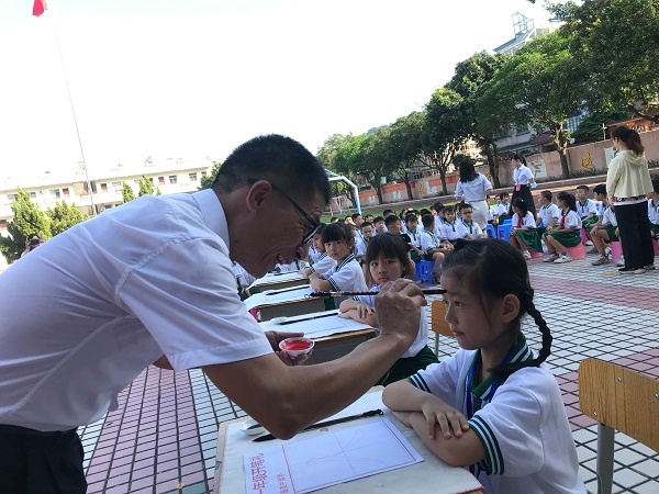 開筆禮第一環(huán)節(jié)是正衣冠,孩子們在低段語文科組長蔡老師的帶領(lǐng)下正衣冠,這是孩子們知書明理的第一步;隨后,在李杰華的帶領(lǐng)下,老師們?yōu)楹⒆觽冎焐皢⒅?,在他們的額頭中間點上朱砂印,祝福他們從此眼亮心明,啟迪智慧。第三環(huán)節(jié)由體育老師擊鼓明智,在三聲鼓聲中,孩子們跟隨謝老師明禮。第四環(huán)節(jié)由書法老師啟蒙描紅,李老師手握毛筆,飽蘸濃墨,在掛起的宣紙上教學生們一撇一捺寫下一個“人”字,寓意在人生的啟蒙階段學會做人是最為重要的。每班學生代表也在紙上認認真真地書寫“人”字并展示;最后一個環(huán)節(jié)是鞠躬敬師,全體老師上臺接受學生三鞠躬,接著向孔子畫像行“三拜禮”,表達尊敬敬師之情。
