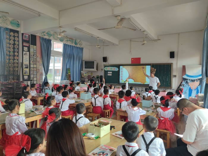 鄭育洲老師執(zhí)教的是二年級(jí)上冊(cè)美術(shù)課《美麗的葉子》。教學(xué)中,鄭育洲老師能立足低年級(jí)學(xué)生興趣發(fā)展的需要,充分運(yùn)用“寓教于樂(lè)”教育理念,通過(guò)各種精美的互動(dòng)道具和課堂故事情節(jié)鋪設(shè),利用故事繪本的“葉子先生”,營(yíng)造出富有童話(huà)情境的美術(shù)課堂,帶領(lǐng)學(xué)生歡樂(lè)愉快地探索葉子美麗的秘密,從而引導(dǎo)學(xué)生利用生活中常見(jiàn)的葉子創(chuàng)作葉子剪貼畫(huà),不僅培養(yǎng)學(xué)生對(duì)生活的細(xì)微觀察,也讓學(xué)生感受到生活充滿(mǎn)美,要“善于發(fā)現(xiàn)美,創(chuàng)造美”的道理。