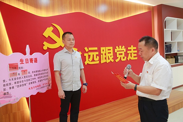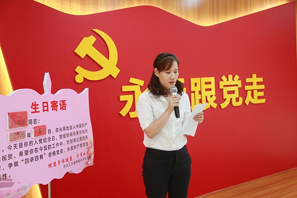 活動中,由支部書記張政同志作簡短發(fā)言,各黨員同志展開座談,接著8位6月份入黨的黨員(黃武清、丘濟新、馮燕顏、戴文慧、張秀芬、王衛(wèi)華、林蔚藍、吳春林)逐個到入黨生日祝賀牌前接受祝賀,博愛中學(xué)黨支部的5名支委分別向8位6月份入黨的黨員同志獻花祝賀,送上賀卡隨后黨員同志黨在黨支部書記張政的引領(lǐng)下,重溫入黨誓詞:“我志愿加入中國共產(chǎn)黨……隨時準備為黨和人民犧牲一切,永不叛黨!”鏗鏘有力的入黨誓詞在會場響起,震撼人心!隨后,8位黨員代表結(jié)合自身入黨經(jīng)歷,發(fā)表“政治生日心語”,回顧總結(jié)了自己的工作體會和思想成長的感悟、收獲,他們個人的成長與組織的關(guān)愛已經(jīng)融為一體,仿佛影片一般一幕幕展現(xiàn),令人感動。