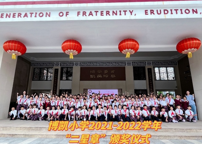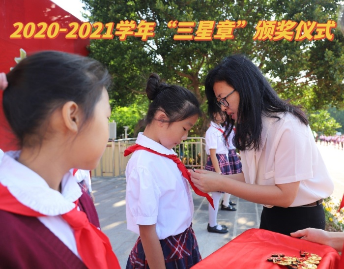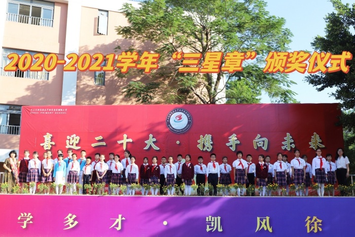 2022年10月19日,在升旗儀式莊重的舞臺上,博凱小學(xué)少工委主任胡冬梅和少工委副主任謝少聲共同為獲得“三星章”和“二星章”的少先隊員們頒發(fā)獎?wù)?。每一枚紅領(lǐng)巾獎?wù)虏粌H僅是一種榮譽,也承載著隊員們的努力和夢想,承載著每一名少先隊員對黨和國家的忠誠與信念。