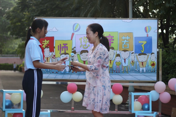 在操場上,旗北小學(xué)兩位學(xué)生為全體教師送出深情的詩朗誦,贊美廣大教師的一路辛勤耕耘,靜能春風(fēng)化雨潤物無聲,動(dòng)能點(diǎn)石成金琢璞成器。隨后,在這幸福、溫馨的時(shí)刻,少先隊(duì)監(jiān)督崗隊(duì)員代表旗北學(xué)子,為教師們送上節(jié)日的禮物和祝福。一聲聲“老師,您辛苦了”的感恩之語在旗北校園傳遞,在旗北教師心間回暖。