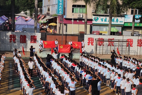 10月11日上午,全校500多名少先隊(duì)員和輔導(dǎo)員齊聚在學(xué)校操場(chǎng)。少先隊(duì)員面向國旗、黨旗、隊(duì)旗敬禮,高歌一曲《少年先鋒隊(duì)隊(duì)歌》,嘹亮歌聲,久久回蕩。在鮮艷的隊(duì)旗下,學(xué)校少工委主任梁綺琴校長帶領(lǐng)全體少先隊(duì)員宣誓,隨后在大隊(duì)輔導(dǎo)員的帶領(lǐng)下,全體少先隊(duì)員高舉右拳,莊嚴(yán)呼號(hào)。鏗鏘的宣誓聲,堅(jiān)定的小拳頭,表達(dá)了少先隊(duì)員們忠于黨,永遠(yuǎn)跟黨走的決心。