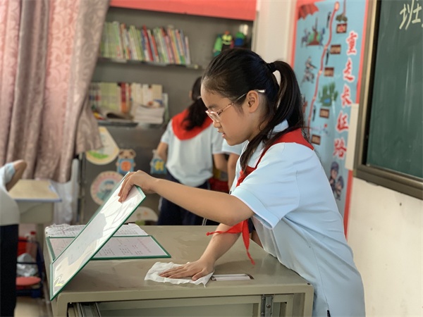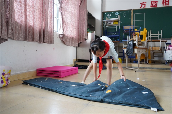 首先是自己的座位與個(gè)人用品的整理,有了平日的指導(dǎo)和訓(xùn)練,隊(duì)員們的動(dòng)作嫻熟,分類整理,把書(shū)包和抽屜收拾得整潔有序;隨后則是班級(jí)衛(wèi)生角、圖書(shū)角、講臺(tái)的整理,他們更是分工明確,有條不紊,在最短的時(shí)間內(nèi)完成了整理項(xiàng)目。最后,各中隊(duì)來(lái)到午休室,為午休寢具做整理。瞧!隊(duì)員們專注地疊著被子和墊子,仔細(xì)地裝進(jìn)收納袋,整齊地放好在指定位置,營(yíng)造了“人人愛(ài)勞動(dòng),人人會(huì)整理,人人懂生活”的校園氛圍。