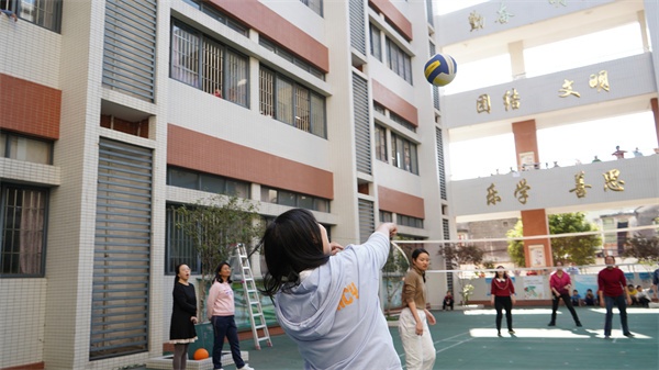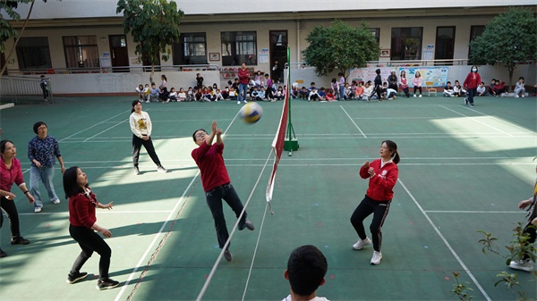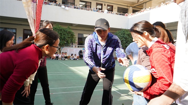 隨著裁判鄭老師一聲哨響,比賽正式拉開帷幕,參賽隊(duì)伍在操場展開激烈比拼。她們個個排兵布陣,精巧安排,以球會友。可謂是“八仙過海,各顯神通”。瞧!一個迅速的扣球,一次精彩的攔網(wǎng),一次奮力的救球,都充分展現(xiàn)出嵐小女老師們合作默契、團(tuán)結(jié)拼搏、昂揚(yáng)向上的精神風(fēng)貌?,F(xiàn)場氣氛熱烈,其樂融融,擊球的節(jié)奏聲、熱烈的加油聲和老師們銀鈴般的歡笑聲,飄蕩在校園上空。