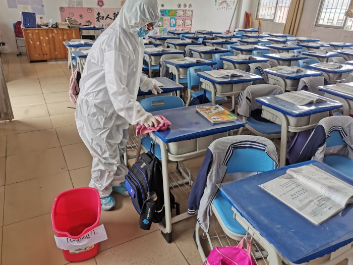 本次演練以如何處置嘔吐物為主,班主任和學(xué)生代表、吳醫(yī)生在譚主任的組織下,有序地進(jìn)行個(gè)人防護(hù)用品的穿戴,包括佩戴口罩、穿好隔離衣、戴好一次性手套和帽子等,隨后將清潔吸附巾覆蓋在嘔吐物等污物上,接著將污濁吸附巾放入原包裝袋密封丟入廢物袋中,再取出濕巾由干凈區(qū)到污濁區(qū)從外至里螺旋式擦拭,至中心區(qū)域后收緊濕巾丟入廢物袋,消毒完成后,依次脫去防護(hù)用具。