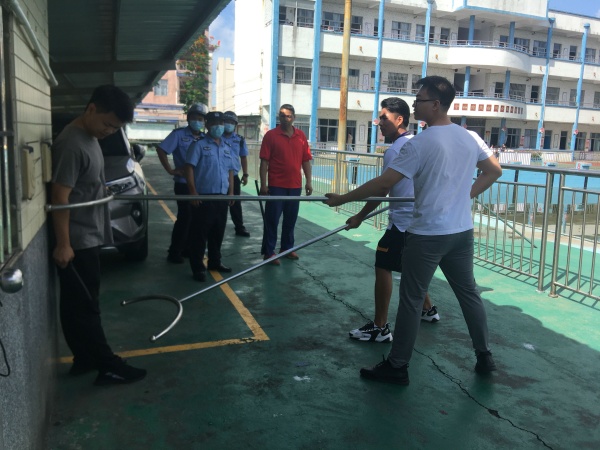 校園暴力事件是校園安全的嚴(yán)重威脅。為了提高校園防暴應(yīng)急能力, 6月19日上午,學(xué)校邀請(qǐng)駐校民警,聯(lián)合村治保會(huì)人員開展了“校園防暴應(yīng)急演練”活動(dòng)?;顒?dòng)模擬演練了當(dāng)天上午,全體師生在操場(chǎng)上進(jìn)行大課間活動(dòng)。突然,暴徒強(qiáng)行闖入校園,保安人員迅速按響“一鍵報(bào)警系統(tǒng)”,防暴警報(bào)信號(hào)緊急響起,教師護(hù)校隊(duì)馬上趕到保安室附近進(jìn)行阻擋。其余師生有序撤離回到教室,關(guān)緊門窗,教師把守教室門口,做好防暴準(zhǔn)備。整個(gè)演練過程,師生沉著應(yīng)對(duì)突發(fā)事件,統(tǒng)一指揮,配合默契。緊張而有序演練活動(dòng),增強(qiáng)了師生安全意識(shí),提高了防暴應(yīng)急能力。