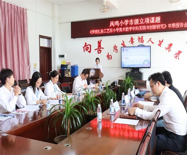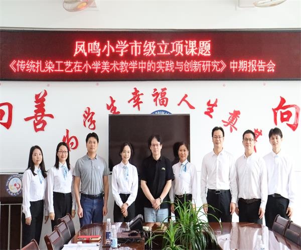 12月7日上午,東鳳鎮(zhèn)鳳鳴小學(xué)舉行了中山市教育科研2020年度青年課題《傳統(tǒng)扎染工藝在小學(xué)美術(shù)教學(xué)中的實踐與創(chuàng)新研究》課題研究的中期匯報會。本次會議邀請了中山市教育教學(xué)研究室美術(shù)教研員沈文老師、東鳳鎮(zhèn)教育和體育事務(wù)中心藝術(shù)專干鄒營發(fā)老師、東鳳鎮(zhèn)教育和體育事務(wù)中心陳林方老師蒞臨指導(dǎo),劉松校長、莊惠茜副校長以及課題組全體成員參會。