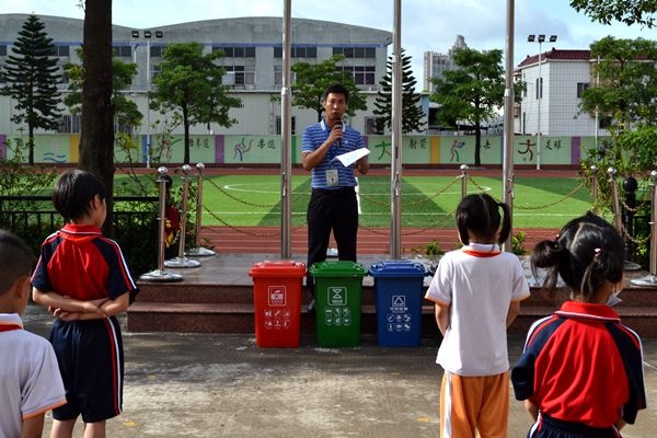 梁桂浩校長從中山市的垃圾現狀入手,讓同學們了解到目前垃圾處理面對的嚴峻形勢,表達出垃圾分類投放的宣傳工作已經迫在眉睫。梁校長還點明校園內的垃圾分類回收點,他表示:“其實垃圾分類離我們并不遙遠,在每一個人的共同努力下,我們的生活和環(huán)境會更加美好。”接下來,梁校長向同學們介紹了垃圾的種類和不同顏色垃圾桶的用途,并現場找學生演示落葉、廢紙、電池、早餐剩余、礦泉水瓶等垃圾分類投放,在演示中特別強調早餐剩余屬于廚余垃圾,但早餐包裝袋是紙質或者塑料袋,屬于可回收垃圾,因此要分開投放。實踐活動后他強調:垃圾分類事小但成效大,對于不能降解的垃圾可采用變廢為寶的方式。垃圾分類并不難,只需做到了解、行動。