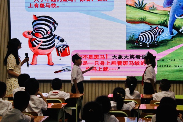 活動第一部分由盧雪飛老師和陳婕妤老師帶來了兩節(jié)精彩紛呈的課例。盧雪飛老師執(zhí)教繪本《小豬變形記》,以親切的語言,耐心的引導,在圖畫“沖擊”中激發(fā)學生閱讀的興趣,指導學生仿照繪本想象小豬和袋鼠的對話。說練的結合,使整個堂課做到了活、趣、實,從而幫助學生打開寫話的大門。陳婕妤老師執(zhí)教習作《變形記》,教學中陳老師既有對學生寫作方法的歸納與提煉——從變形后的事物視角看世界、用修辭把特定遭遇寫清楚、賦予變形對象人的感受;又有學生喜聞樂見的情境說寫指導和妙趣橫生的范例分析、引導,使學生說得有趣,寫得精彩。