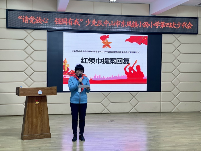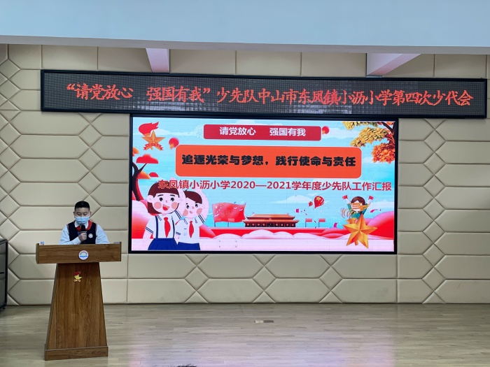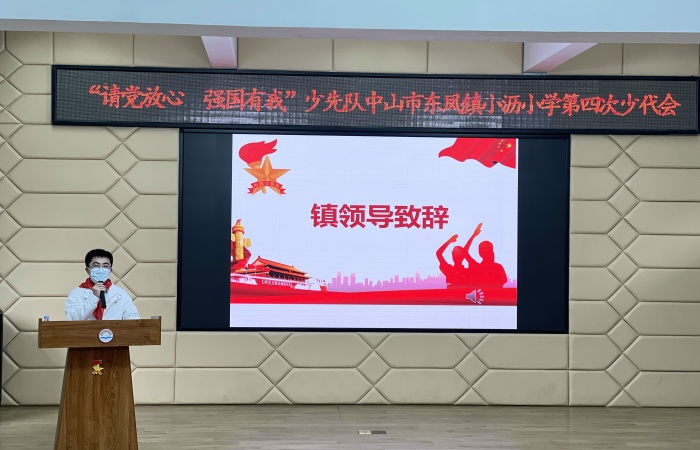 為進(jìn)一步增強(qiáng)少先隊(duì)員的光榮感和使命感,貫徹落實(shí)《中共中央關(guān)于全面加強(qiáng)新時(shí)代少先隊(duì)工作的意見(jiàn)》,落實(shí)黨的十九屆六中全會(huì)精神,傳承紅色基因,賡續(xù)精神血脈,在中山市東鳳鎮(zhèn)團(tuán)委、東鳳鎮(zhèn)少工委、東鳳鎮(zhèn)小瀝社區(qū)少工委的指導(dǎo)下,12月27日,小瀝小學(xué)召開(kāi)了以“請(qǐng)黨放心,強(qiáng)國(guó)有我”為主題的第四次少代會(huì)。東鳳鎮(zhèn)團(tuán)委書(shū)記李泰杰、東鳳鎮(zhèn)小瀝社區(qū)黨委委員、少工委主任張河佳,學(xué)校黨支部書(shū)記、少工委主任高強(qiáng)輝,以及學(xué)校黨支部代表、學(xué)校委員會(huì)代表、學(xué)校家委會(huì)代表、學(xué)校少工委委員、學(xué)校少先隊(duì)輔導(dǎo)員代表和學(xué)校少先隊(duì)員代表參加了會(huì)議。