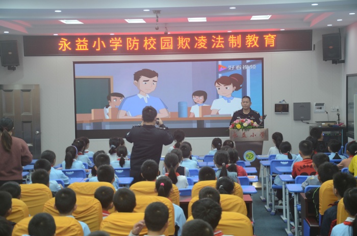 為了增強(qiáng)師生法制意識,進(jìn)一步提高預(yù)防校園欺凌的意識和能力,2021年12月15日下午,永益小學(xué)特邀駐校民警張火根警官為四年級師生開展了一場別開生面的預(yù)防校園欺凌法制教育講座。