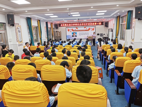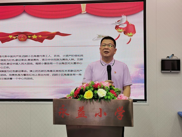 為深入貫徹落實(shí)《新時(shí)代愛國主義教育實(shí)施綱要》,大力弘揚(yáng)以愛國主義為核心的民族精神,樹立全校師生的愛國意識(shí),弘揚(yáng)愛國主義精神,慶祝中華人民共和國成立72周年,營造新時(shí)代愛國主義教育的濃厚氛圍,10月9日下午東鳳鎮(zhèn)永益小學(xué)蔣漢云校長為五年級(jí)學(xué)生開展了“盛世中國夢,童心向祖國”主題的思政第一課。