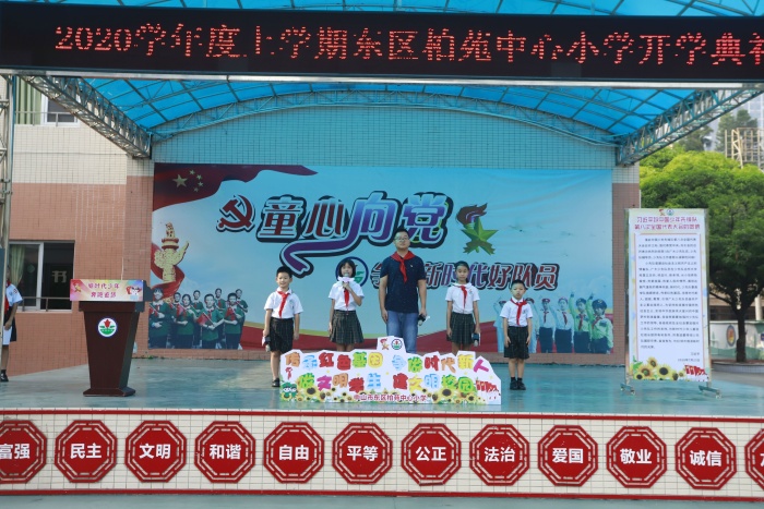 為勉勵廣大少年兒童牢記習(xí)近平總書記的教導(dǎo),以習(xí)近平新時代中國特色社會主義思想為指導(dǎo),傳承紅色基因,踐行社會主義核心價值觀,學(xué)習(xí)身邊的榜樣,做新時代的好少年,為實(shí)現(xiàn)中華民族偉大復(fù)興的中國夢而努力奮斗,助力全市奮勇奪取全國文明城市“六連冠”,共同創(chuàng)造更美好的生活。2020年9月1日上午,東區(qū)柏苑中心小學(xué)舉行了以“傳承紅色基因,爭做時代新人”為主題的開學(xué)典禮。