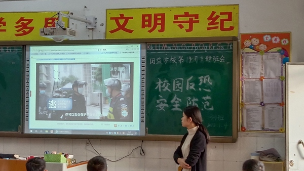 組織全校各班積極進(jìn)行主題班會,活動依托安全教育平臺,收看《守護(hù)校園安全,從我做起》,開展校園反恐安全防范教育。