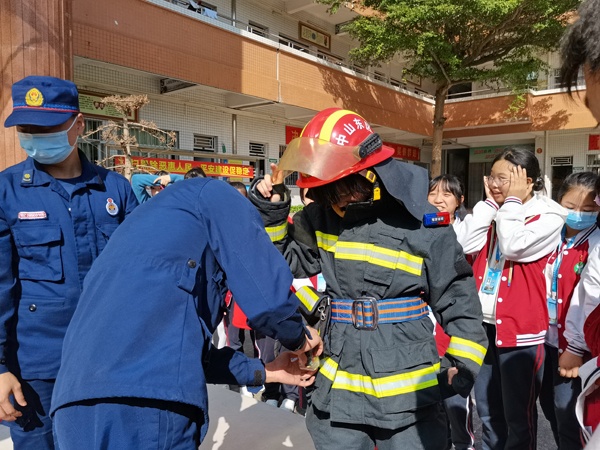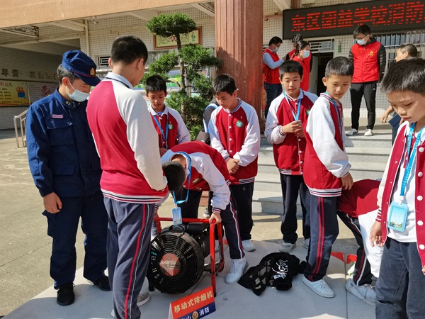演練結(jié)束后,同學(xué)們到消防器材展示區(qū)參觀,東區(qū)消防中隊(duì)隊(duì)員給大家講解消防器材的作用和使用方法。師生輪流體驗(yàn)這些器材的使用,當(dāng)穿上幾十斤重的消防服,才深刻體會(huì)到當(dāng)消防員的不容易,對(duì)消防員更加的敬佩。
