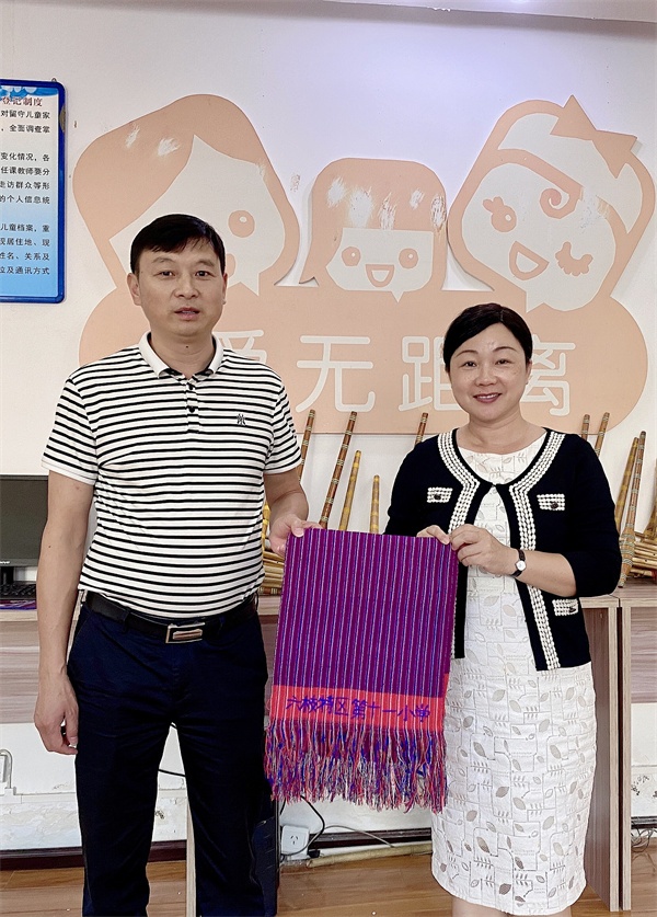 29日上午,學校的大課間活動,第十一小600多名學生們展示代表辦學特色、具有民族風情的竹筒舞,展示了獨特的貴州民族文化,學生們的表演十分精彩。接著是到學校手工室的參觀活動。鄧海校長親自展示織布機的使用方法,最后還送給雍景園小學織好的繡有“六枝特區(qū)第十一小學”字樣的手工成品留作紀念。