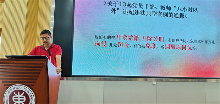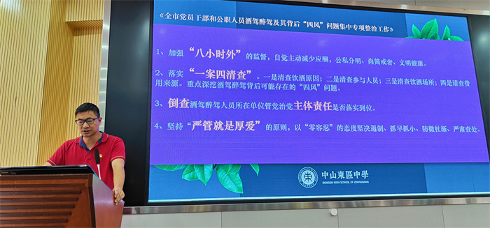 會上,蔡昌盛同志帶領全體教職工學習了《關于在全市開展黨員干部和公職人員酒駕醉駕及其背后“四風”問題專項整治的工作方案》。同時,對個別黨員干部、教師“八小時以外”違紀違法典型案例的通報進行了再學習,為全體教職工明確了糾“四風”和酒駕醉駕重點工作及相關要求。要求全體教職員工提高思想認知,端正工作態(tài)度,堅決杜絕頂風違紀行為,進一步積極營造風清氣正的工作氛圍。同時,對全體教職工提出倡議,希望大家提高思想覺悟,守住生活警戒線,帶頭遵守法律法規(guī)、黨紀黨規(guī)、社會公德。自覺主動減少應酬,把時間和精力用在干事創(chuàng)業(yè)和陪伴家人上,樹立公私分明、尚簡戒奢、文明健康的新風正氣。