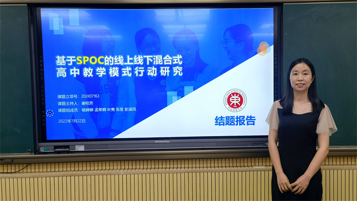 謝柏芳校長主持的課題《基于SPOC的線上線下混合式高中教學(xué)模式行動研究》以后疫情時(shí)代較為流行的線上線下混合式教學(xué)為研究主題,結(jié)合最新的SPOC理念,探索在高中日常教學(xué)中開展適合校情的分層不分班的混合式教學(xué)模式。該課題由課題組成員楊婷婷老師代表匯報(bào)。楊老師在匯報(bào)中著重介紹了課題的研究過程和研究結(jié)果。從前期的師生調(diào)查到兩輪教學(xué)實(shí)踐對模式的修正調(diào)整,再到最后形成模式,楊老師對課題組的研究過程做了詳細(xì)的展示。經(jīng)過兩年的研究,該課題組發(fā)表了論文4篇,獲獎7篇,沉淀了三本校本教材、教學(xué)資源庫和學(xué)生的個(gè)性化學(xué)習(xí)檔案袋等大量的一手資料,并多次走出去引進(jìn)來交流推廣,取得了一定的成效。