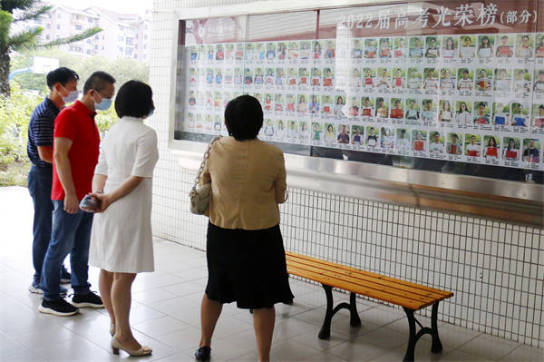 走到折桂路上,馮副主席指出,桂花樹下的條木椅和四墩上刻著的詩詞這一設(shè)計(jì)非常好,讓同學(xué)們在休憩的閑暇,也可以有意無意地欣賞中國古詩詞,浸潤中國優(yōu)秀傳統(tǒng)文化。當(dāng)聽到謝柏芳校長介紹折桂路的來歷,以及謝校長會(huì)在折桂路上為優(yōu)秀的同學(xué)拍照紀(jì)念的時(shí)候,馮副主席更加肯定學(xué)校這種非常用心用情做教育的做法和情懷。