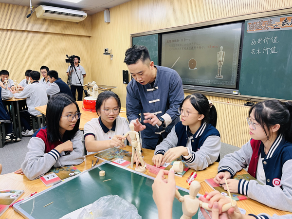 “咚…咚咚…咚咚咚”,施恒老師以鼓奏樂,以家鄉(xiāng)閩南非遺文化說唱片段導(dǎo)入課堂,并運用多元式對話場景開展教學(xué)活動,通過“魔法”技術(shù)的設(shè)疑,引導(dǎo)學(xué)生跟隨線索識別擊鼓說唱俑獨特的面部特征,通過人偶關(guān)節(jié)定點的擺動,學(xué)生化身工匠人,感受不同姿態(tài)動作帶來的傳神趣味體驗。課堂的最后,施恒老師以說明介紹文字標簽為導(dǎo)引,牽引學(xué)生用精簡的文字了解不同姿態(tài)的說唱俑形象并準確識別擺放說唱俑正確位置,通過本節(jié)課,讓學(xué)生感受漢代說唱藝人的樂天與自由。