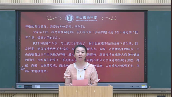本次升旗儀式由校團(tuán)委羅汶濤老師主持,心理老師謝桂嫻在國(guó)旗下進(jìn)行了主題為《在不確定的世界里,做確定的自己》的主題講話。謝老師指出我們感到焦慮的不是不確定性,而是對(duì)不確定性的容忍度,并針對(duì)疫情下開展網(wǎng)課,給出以下五點(diǎn)建議:提高信息判斷力、為不確定的事賦予積極的意義、用目標(biāo)清單法增加生活可控感、接納因不確定帶來(lái)的各種情緒、并在需要時(shí)主動(dòng)尋求支持與幫助。