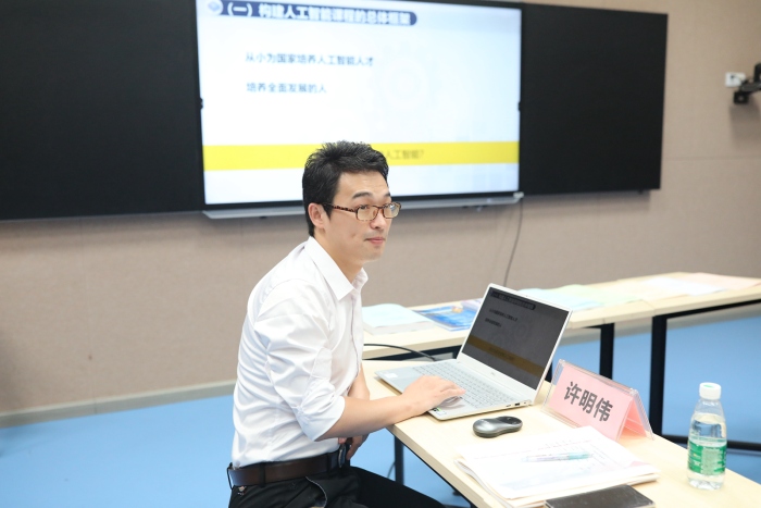 會(huì)議第一項(xiàng),課題主持人許明偉老師做課題研究結(jié)題報(bào)告匯報(bào)。他分別從研究背景、研究實(shí)施、研究成效、研究思考還有研究收獲七個(gè)方面,對(duì)課題的研究過程和研究結(jié)果,進(jìn)行了詳盡的總結(jié)匯報(bào)。匯報(bào)中,許老師緊緊圍繞課題的研究目標(biāo),圍繞研究內(nèi)容,沿著課程開發(fā)的過程展開深入研究。課題組梳理了人工智能教育的現(xiàn)狀與不足,構(gòu)建了新形勢的“1+2”的人工智能教育課程體系,并開發(fā)設(shè)計(jì)了校本化的人工智能學(xué)生項(xiàng)目手冊(cè);課題組積極開展體驗(yàn)課程、思維課程與實(shí)踐課程的教學(xué)實(shí)踐,基于學(xué)生的認(rèn)知水平,對(duì)應(yīng)以體驗(yàn)式教學(xué)、基于問題解決和項(xiàng)目學(xué)習(xí)的教學(xué)策略展開教學(xué),并提煉出課程實(shí)施的教學(xué)模式,形成了可操作、可推廣的經(jīng)驗(yàn)。課題組還將課程開發(fā)與實(shí)踐的經(jīng)驗(yàn)撰寫成四篇論文,分別發(fā)表在《教育信息技術(shù)》,《中國信息技術(shù)教育》和《中小學(xué)信息技術(shù)教育》等信息技術(shù)教學(xué)權(quán)威雜志上。