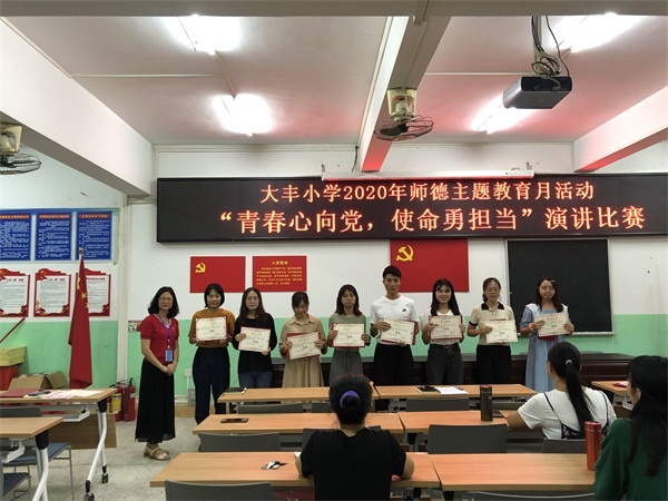 為了進一步加強師德師風建設(shè),全面提升教師思想政治素質(zhì)和職業(yè)道德水平,努力造就一支師德高尚、業(yè)務(wù)精湛、充滿活力的高素質(zhì)教師隊伍,10月12日下午,大豐小學結(jié)合“不忘初心、牢記使命”師德建設(shè)主題教育月活動舉行了一次“青春心向黨,使命勇?lián)敗钡难葜v比賽。