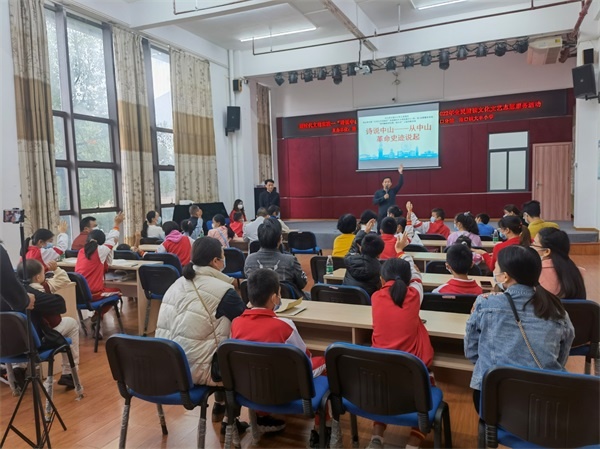 為了讓孩子了解中山革命史跡,了解中山名人的事跡,體驗(yàn)先輩的愛(ài)國(guó)情懷、慈善思想、務(wù)實(shí)作風(fēng),11月6日上午,港口鎮(zhèn)宣傳文化服務(wù)中心、中山紀(jì)念圖書(shū)館港口分館、港口鎮(zhèn)大豐小學(xué)聯(lián)合邀請(qǐng)了中華詩(shī)詞學(xué)會(huì)會(huì)員、廣東楹聯(lián)學(xué)會(huì)副會(huì)長(zhǎng)、中山市中華詩(shī)詞楹聯(lián)學(xué)會(huì)會(huì)長(zhǎng)高松老師,開(kāi)展了一場(chǎng)主題為“革命詩(shī)中學(xué)黨史,從中山革命史跡說(shuō)起”的閱讀推廣活動(dòng)。