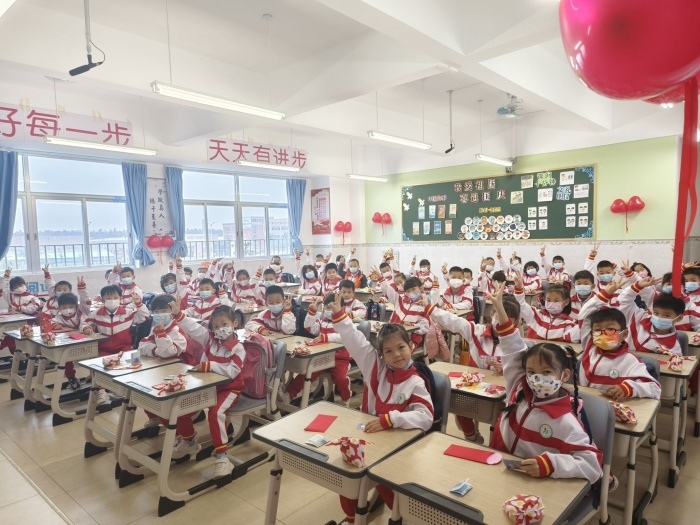 春風(fēng)拂面,盼你歸來。校門口,學(xué)校行政和老師們身穿紅色衣服或系紅色圍巾,排列于校門兩端,等待著孩子們的歸來。同學(xué)們著裝整齊,張張笑臉、聲聲問候,讓開學(xué)第一天的清晨充滿溫馨和甜蜜。值得一提的是,新學(xué)期校園里迎來了兩位特殊的朋友:學(xué)??ㄍ槲铩斑M進”和“步步”,他們手拿“學(xué)得快樂,玩得聰明”揮春,擺動著萌萌的身體,熱情地跟每一位進校的同學(xué)問好?!斑M進”和“步步”體現(xiàn)了大豐“走好每一步,天天有進步”的辦學(xué)理念,“學(xué)得快樂,玩得聰明”則是總校智趣教育學(xué)風(fēng)的要求。他們將會陪伴所有豐小學(xué)子一起健康成長,度過幸福童年。教室里,新學(xué)期、新希望、新夢想,為了激發(fā)學(xué)生的自豪感,營造溫馨的班級氛圍,促使學(xué)生在學(xué)校的大家庭里能愉快地學(xué)習(xí)和生活,老師們精心布置教室:多彩的板報彰顯了對孩子們真誠的歡迎,精美的禮物承載著老師們的殷殷祝福,五彩繽紛的氣球滿載著教育者的深情。別出心裁的入校和入班儀式,體現(xiàn)了學(xué)校對孩子們滿滿的祝福和期許。