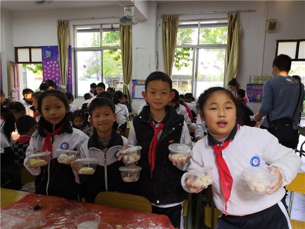 在搓湯圓活動中,師生們鋪好桌子,分好材料,挽起袖子,戴上手套,同學們的臉上洋溢著躍躍欲試的興奮。紛紛學著老師的動作,先在手上抹點面粉,然后再掐一塊糯米粉團,把它壓成一片,再在中間用手指弄一個窩窩,里面放上調好的餡料,外面再用糯米粉揉成一個“小球”,一個胖乎乎、圓滾滾的湯圓就做好了?!拔页晒玻 焙⒆觽兗娂娔贸鲎约旱陌玫臏珗A向老師和同伴炫耀著,紅彤彤的臉上洋溢著比湯圓還甜的笑容。