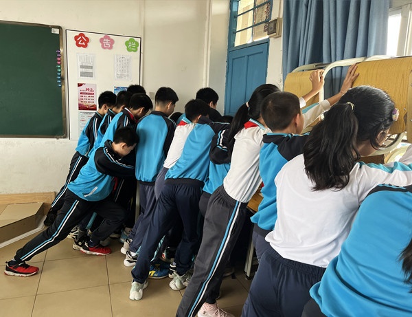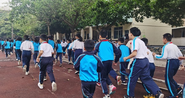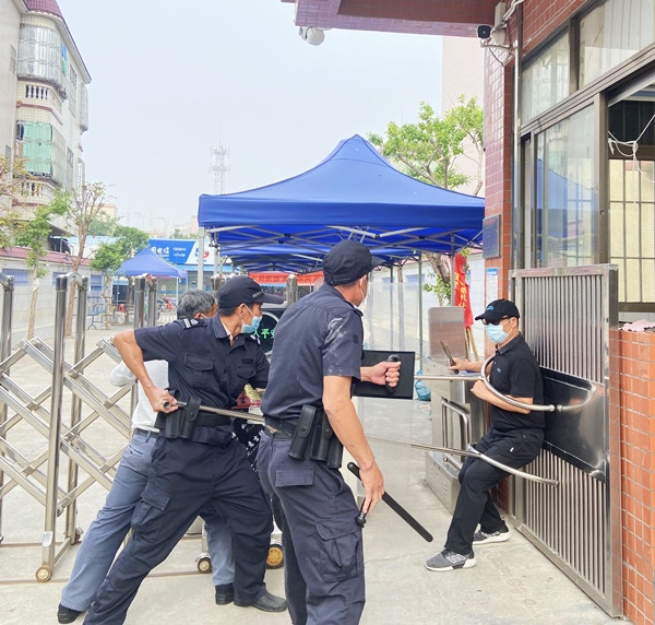 演練開始,師生們正在操場上開展大課間活動。這時,一名男子來到學(xué)校門口,大聲吵鬧。值班門衛(wèi)迅速帶著警棍上前勸阻,該男子不以為然,反而拿刀具強行闖進校門,另一門衛(wèi)見狀,立即報告校長并通過“一鍵緊急報警系統(tǒng)”向公安部門報警。校長接報后,馬上指示梁森明主任聯(lián)系楊瓊威老師。緊接著,楊老師連忙利用廣播通知師生校門口發(fā)生暴力事件,現(xiàn)啟動學(xué)校防恐防暴應(yīng)急預(yù)案,請學(xué)校護衛(wèi)隊以最快速度到達門口參加護校工作,協(xié)助撤離的老師快速到指定站點,各班主任組織學(xué)生有序、迅速撤離回課室。隨即警報拉響,605名學(xué)生僅用了45秒便全部安全撤回到課室,當(dāng)即開展了鎖門關(guān)窗,用凳子、桌子抵住門窗等一系列的護班行動。此時,安全護衛(wèi)隊員與保安人員一起奮不顧身、臨危不懼,圍追堵截“暴徒”,終于成功制服“暴徒”,圓滿完成了演練預(yù)定任務(wù)。