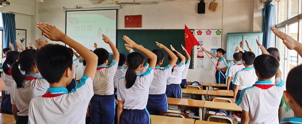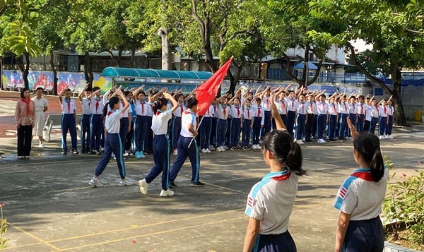 11日上午,升旗儀式后,全校舉行了少先隊微儀式。護旗手們舉著中國少年先鋒隊隊旗,邁著堅定整齊的步伐進場。神采奕奕的少先隊員們面向著隊旗敬禮,心里的尊敬與自豪不言而喻。隊員們在六(2)中隊黎冰同學(xué)的指揮下,認(rèn)真地唱著隊歌。緊接著,全體少先隊員重溫了入隊誓詞,高亢嘹亮的宣誓聲,響徹校園,表達(dá)了新時代少先隊員的壯志豪情。學(xué)校少工委主任梁容根同志也為全體少先隊員送上了寄語,希望每一位隊員要以實現(xiàn)中華民族偉大復(fù)興為己任,不負(fù)黨和人民的殷切期望。最后,大隊輔導(dǎo)員帶領(lǐng)著全體隊員莊嚴(yán)呼號。