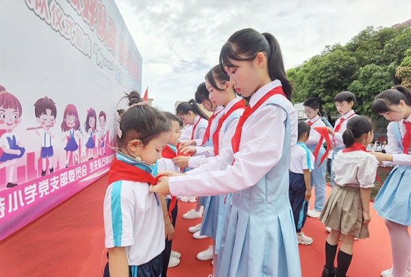 入隊儀式上,隊旗熠熠生輝,隊歌嘹亮動人,六年級隊員為新隊員佩戴紅領(lǐng)巾。當(dāng)鮮艷的紅領(lǐng)巾佩戴在胸前的那一刻,新隊員們的肩上便多了一份為共產(chǎn)主義事業(yè)奮斗的大任。隨后,新隊員們在鮮艷的隊旗下高舉右手,莊嚴宣誓,立志成為一名合格的少先隊員。高舉紅色隊旗,傳承紅色基因。蘇校長為新建中隊授中隊旗,并為中隊輔導(dǎo)員頒發(fā)聘書。同時,蘇校長面向全體人員親切致辭,她向全校兒童致以最誠摯的節(jié)日祝福,希望同學(xué)們在少先隊活動中培養(yǎng)理想信念、強健體魄、磨練意志,成為有理想,有本領(lǐng),有擔(dān)當(dāng)?shù)男聲r代好隊員。最后,入隊儀式在隊員們鏗鏘有力的呼號聲中落下帷幕。