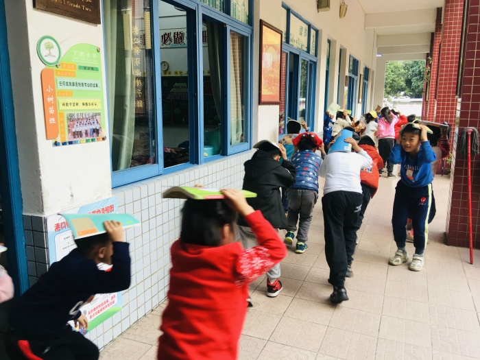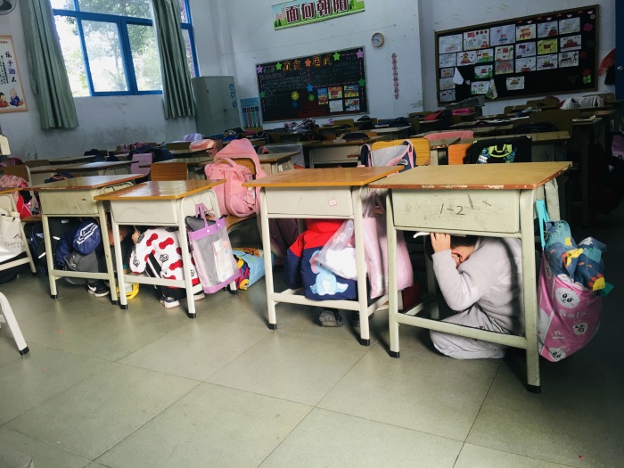 下午16點(diǎn)40分,廣播發(fā)出地震避險(xiǎn)警報(bào)信號(hào),意為此時(shí)感知地震等災(zāi)害發(fā)生,學(xué)生就地躲避,將身體縮成一團(tuán),用手護(hù)住頭和胸,躲在課桌底下,各教職工迅速到達(dá)各自崗位。
